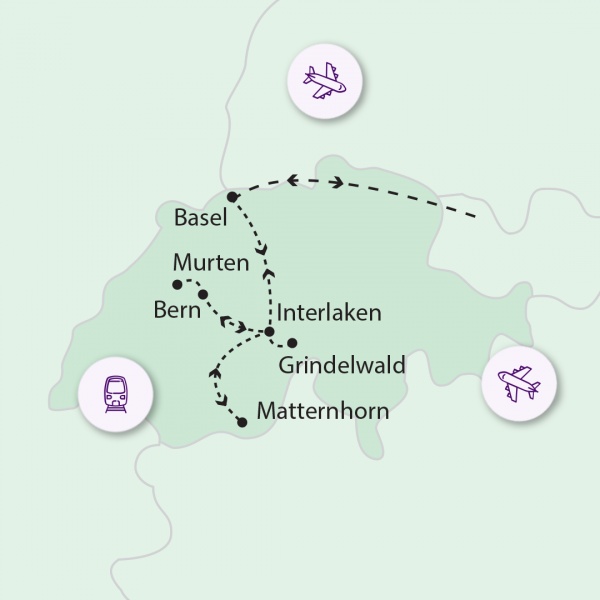 Menetrend szerint idegenvezetőnkkel Budapestről a Basel EuroAirport repülőtérre utazunk. A légikikötő területileg Franciaországban található, de egyedülálló módon, hármas (svájci, francia, német) fennhatóság alatt áll. A repülőtérről busszal megyünk a baseli vasútállomásig, ahonnan vonattal utazunk tovább Interlakenbe. Négynapos Swiss Pass-t, azaz svájci utazási bérletet használunk az utazásaink során (1-4. napig). A Swiss Pass megvásárlása kötelező, összegét foglaláskor feltüntetjük. A Swiss Pass vagy ingyenes, vagy nagymértékű kedvezményt ad azokra a vonatjegyekre, felvonójegyre, hajójegyre, buszjegyre, amiket a programunk során igénybe veszünk. Vonatunkkal Interlakenbe a délutáni órákban érkezünk. Először a szállásunkat foglaljuk el, mely közel van a pályaudvarhoz (3 éj). Ez azért is fontos, mert a csomagját mindenki maga viszi a reptérről a vasútállomásig, majd onnan a szállodáig, illetve majd hazafelé is. Javasoljuk, hogy holmiját húzható bőröndbe, hátizsákba csomagolja. A szállodai elhelyezkedés után séta a hegyek és tavak közé ékelődött Interlakenben. Akinek kedve van, átsétálhat Unterseebe is. Szervezett közös vacsora az út során nem lesz, de az idegenvezető mindig segít azoknak, akik meleg vacsorát szeretnének elfogyasztani.