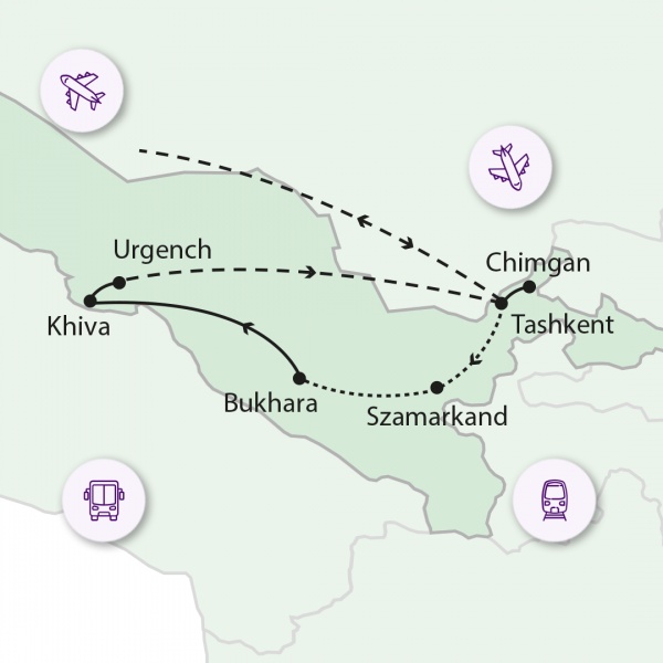 Délelőtti indulás Budapestről repülővel. Az esti órákban átszállunk, majd tovább utazunk Tashkentbe. Éjszaka a repülőn.
