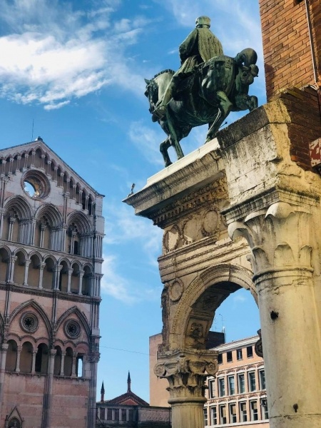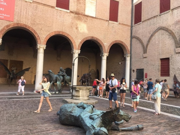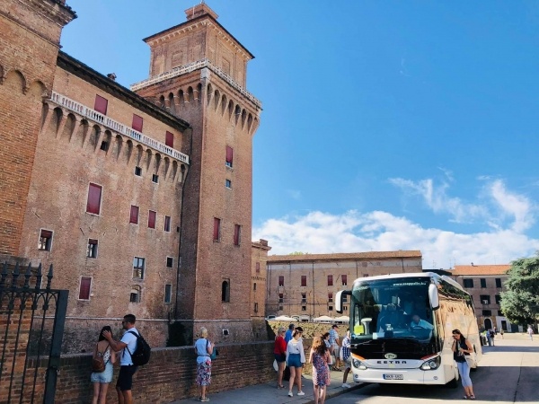 Elutazás Szegedről a kora reggeli órákban. Utazás Szlovénián át (Tornyiszentmiklós határátkelő), Olaszországba. Útközben rövid pihenőt tartunk a festői elhelyezkedésű Duino kastélynál, mely 400 éve a Della Torre olasz család tulajdonában van. Meglátogatjuk pompás kertjét és a kastélyba is betekintünk. A kastélyból csodálatos kilátás nyílik a meredek sziklákkal övezett tengerre. Megérkezés az esti órákban Ferrara környéki szálláshelyünkre.