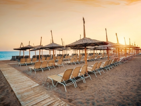 homokos tengerpart, néhol kavocsos (napágyak és napernyők ingyen)