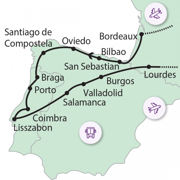 Utunk egyik legjelentősebb látványosságához, Santiago de Compostelához érkezünk ezen a napon, ahol városnézést tartunk. Szent Jakab sírhelye köré épült a város, ahova már a XII. században zarándoklatok indultak. Mai napig a híres El Camino zarándokút célállomása. A város őrzi középkori hangulatát. Sétálunk a központban, ódon utcák, Városháza, Egyetem, Katolikus Királyok Kórháza és a világhírű katedrális, melynek barokk-kori külsője egy románkori templomot rejt. Az út során megállapíthatjuk, hogy Észak-Spanyolország legalább annyi műremekkel rendelkezik, mint Andalúzia. Galíciát elhagyva érkezünk Portugáliába. Első programunk Braga hangulatos óvárosában lesz. Az ország legrégebbi katedrálisa és annak környéke több évszázad emlékeit hordozza. A hangulatos óváros megtekintése után portói szálláshelyünkre utazunk, ahol vacsora (2 éj).