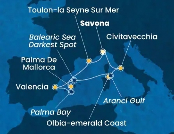 Az útvonal következő állomása a Szardínia észak-keleti részén, a híres Smaragd-part mentén fekvő kikötőváros, melynek természeti szépsége rabul ejti a látogatót. A városban és környéken töltött idő méltó része ennek az élményekben gazdag hajóútnak.