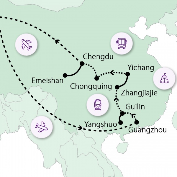 Ma Chongqing felfedezését a történelmi Liziba vasútállomásnál kezdjük, ahol az egyik vasútvonal egy 19 emeletes lakóépület 6-8. szintjén halad keresztül. Ez az ikonikus szakasz a város egyedi, hegyvidéki építészetének és mérnöki kreativitásának látványos példája. Ezután a hangulatos Mountain City Lane utcáin sétálunk, ahol a város hegyvidéki jellegét élhetjük át. Ezután a híres Liberation Stele térre látogatunk, amely a város kulturális és történelmi központja. A városnézés után gyorsvonattal utazunk Chengduba, ahol szállásunk is lesz.