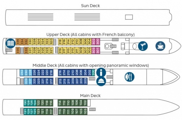 A kényelmes kabinok légkondicionálóval, hajszárítóval, telefonnal, TV-vel, minibárral, és széffel felszereltek. Főfedélzeten: 11,5 nm-es ablakos, külső kabinok, az ablakok nem nyithatóak. Középső fedélzeten: 14,5 nm-es ablakos kabinok, az ablakok nyithatóak.Felső fedélzeten: 14,5 nm-es francia erkélyes kabinok.