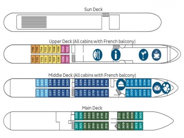 A kényelmes kabinok légkondicionálóval, hajszárítóval, telefonnal, és TV-vel, minibárral, és széffel felszereltek. Főfedélzeten: 16 nm-es ablakos, külső kabinok, az ablakok nem nyithatóak. Középső és felső fedélzeten: 16 nm-es francia erkélyes kabinok