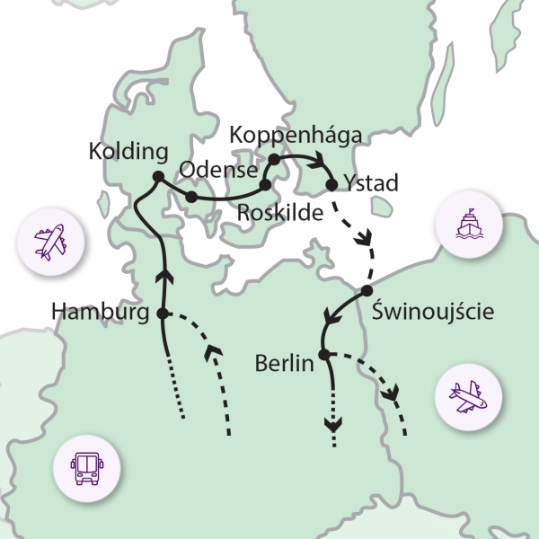 Reggel egy hídon átkelve a Funen szigetre érkezünk. A nagy dán mesemondó, Andersen is ezen a szigeten élt. Először megnézzük Fyn városát, mely egy skanzen. Bemutatja, hogy éltek a dán emberek az 1800-as években. A több mint 25 farmházból álló múzeumban profi színészek segítségével ismerhetjük meg a falusi emberek életét. Tovább haladva Odensébe érünk, amely e kis sziget ,,fővárosa" és Dánia 3. legnagyobb városa. Itt született és nevelkedett Andersen. Meglátogatjuk szülőházát, illetve az életéről és munkásságáról szóló múzeumot is. A szűk és kanyargós kis utcákon sétálva megelevenedik előttünk mindaz, melyről történeteiben mesél. Következő állomásunk Egeskov kastélya lesz. Fyn 123 kastélya közül ez a legszebb. A kastély gróf Ahlefeld család tulajdona. A csodálatos kertben is sétálhatunk, amely bekerült a világ 12 legszebb kertjének rangsorába. A kastélyt elhagyva egy újabb hídon kelünk át és utazunk tovább szállásunkra.