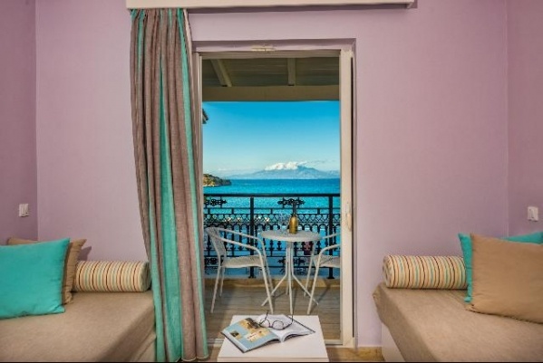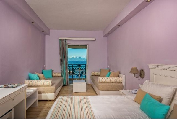 A település csendesebb részén, közvetlenül a homokos tengerparton (kb. 30 m) elhelyezkedő, egy domboldalon épűlt, fő és melléképületből álló, 4 szintes 159 szobás szállodakomplexum. A medencéhez és a tengerpartra lépcsőkön keresztül lehet eljutni. A legközelebbi buszmegálló egy kényelmes sétával (kb. 500) elérhető. A település központja kb. 1 km távolságban, ahol tavernák, bárok, kávézók, üzletek, vendéglők találhatók.