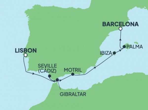 A Földközi-tenger nyugati medencéjében számtalan nép hagyta örökül történelmi emlékeit. Mindezek mellett az Ibériai-félsziget meseszép tájakkal és izgalmas településekkel is hívogat. Hajóutunk során a nyüzsgő Barcelonából indulunk, kikötünk a bájos Mallorca szigetén és a pezsgő Valenciában. Továbbhajózva dél felé, elérjük Andalúzia partjait, ahol először Motrilban, majd Cadizban időzünk, és nem hagyjuk ki Gibraltár jellegzetes szikláit sem. Utunk végén Portugália két izgalmas régiójába érkezünk: először a vadregényes partjairól ismert Algarve-ot ismerhetjük meg Portim?oból indulva, végül pedig az elragadó portugál főváros, Lisszabon nevezetességeit járjuk be.