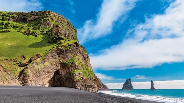 Izland déli partvidéke számtalan lenyűgöző természeti élményt tartogat. A part fölé hatalmas vulkánok emelkednek, például a híres Eyjafjallajökull. A vulkánok között bukik alá a Skógafoss-vízesés, amely 60 méteres mélységbe zuhan, és vízpárával árasztja el az odalátogatókat. Ezután kitérőt teszünk a Sólheimajökull gleccsernyelvhez (kedvező időjárás esetén). Kontrasztként feltárul előttünk a híres Reynisfjara fekete lávapart, amelyet szögletes bazaltoszlopok díszítenek. Ezután visszatérés a hotelbe.