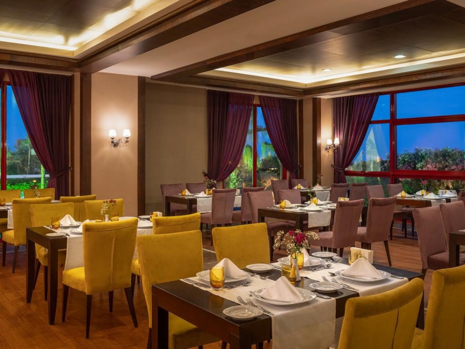 A szálloda központi éttermén kívül 4 a’la carte étterem (török, olasz, ázsiai, barbeque) is a vendégek rendelkezésére áll térítés ellenében, előzetes foglalással. A tartózkodás során egyszeri étkezés az á la carte éttermek egyikében biztosított.
