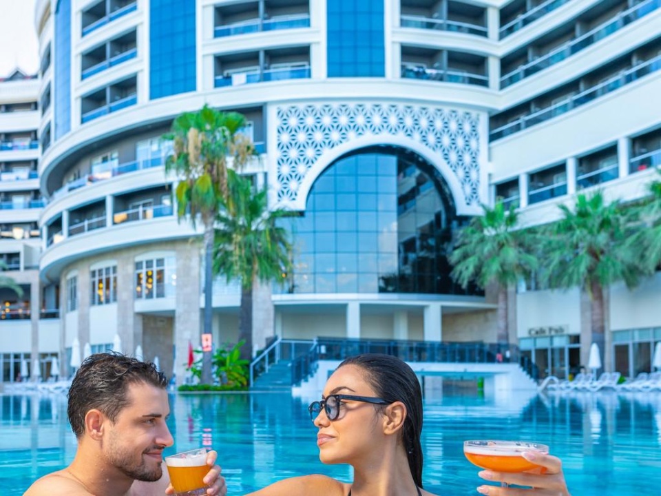 Szállás leírás: Az 5*-os, összesen 290 szobával rendelkező, családias szálloda kb. 25 km-re Side és kb. 33 km-re Alanya városközpontjától, közvetlenül a homokos-kavicsos tengerparton helyezkedik el.