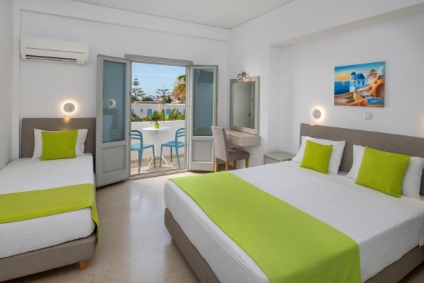 A szálloda légkondicionált, világos, mediterrán stílusban berendezett szobákat kínál, amelyek mind saját fürdőszobával rendelkeznek. Minden szobában található televízió, hűtőszekrény és ingyenes Wi-Fi-hozzáférés, továbbá a legtöbb szobához erkéllyel vagy terasszal rendelkező kültéri tér tartozik, ahonnan részleges vagy teljes kilátás nyílhat a tengerre vagy a környező tájra. A szobák elrendezése lehetővé teszi párok, családok vagy baráti társaságok számára is a kényelmes elhelyezést.