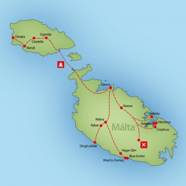 A Földközi-tenger szigetállama, az egész évben napsütéses Málta maga a megelevenedő történelem 7000 éves múltjával: a civilizáció hajnalából származó emlékek, katedrálisok, erődök, középkori városok, a máltai lovagrend öröksége, mindezeknek tökéletes hátteret biztosítanak a mesés természeti kincsek, és a Földközi-tenger kékje