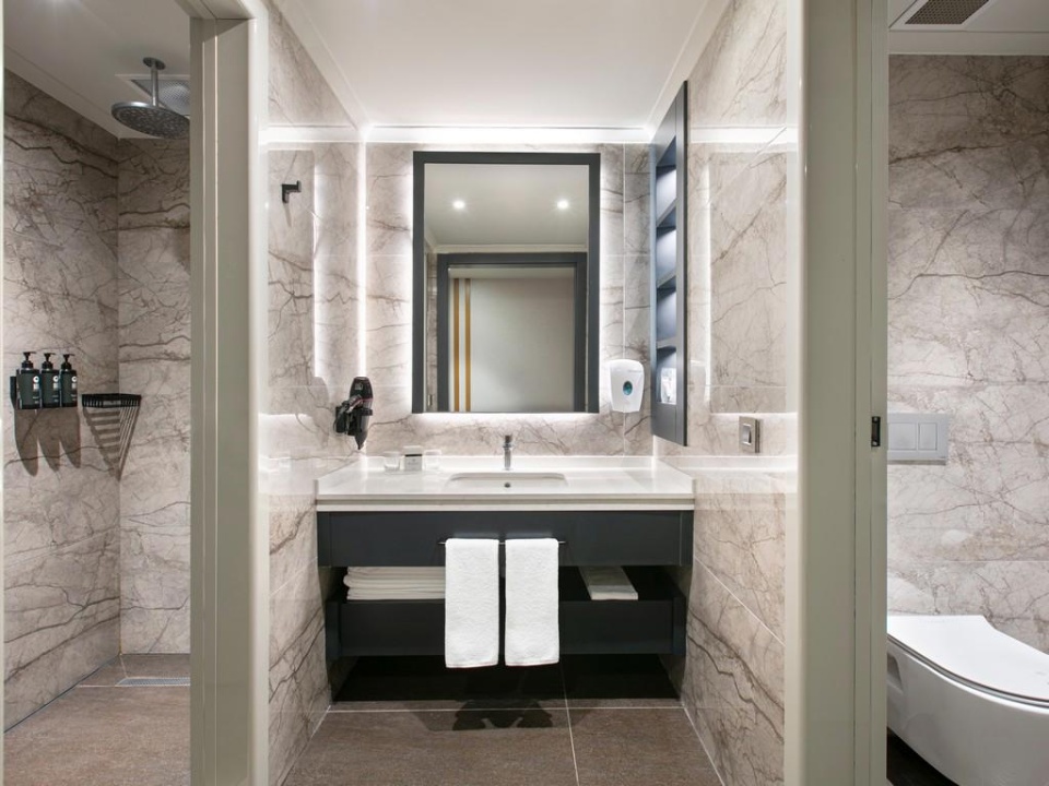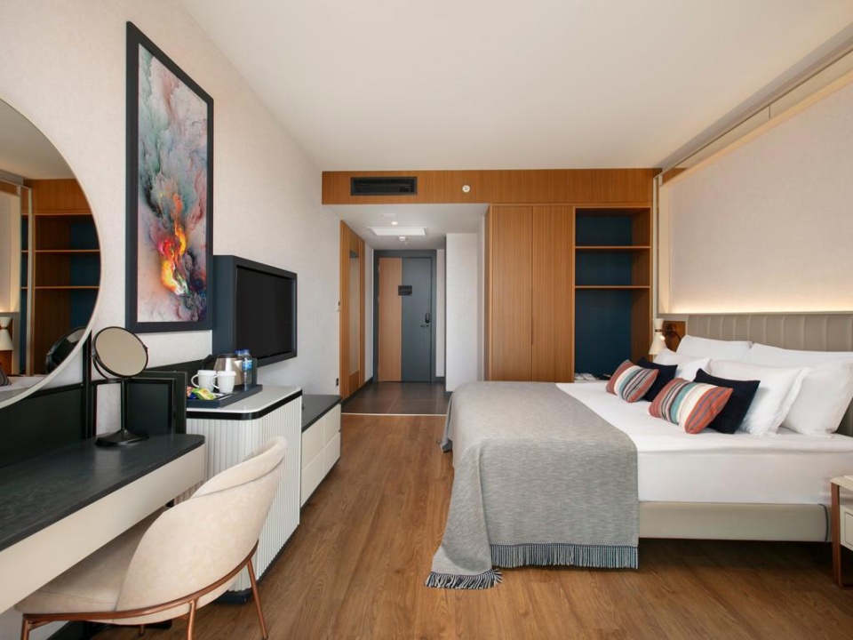 SZOBÁK: 454 szoba • erkély • központi légkondicionálás • hajszárító • TV • telefon térítés ellenében • minibár • papucs • kávé- és teakészítő szett • széf • wifi • Standard szoba kertre néző kilátással: kb. 35 m² • Standard szoba tengerre néző kilátással: kb. 30 m² • Superior szobák: kb. 33–40 m²