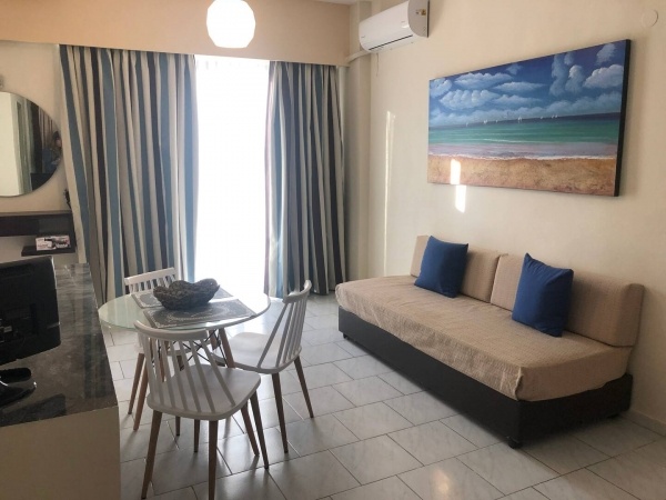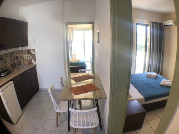 - 2 ágyas stúdió: Kellemesen berendezett, kényelmes, utcára/medencére néző, egy légterű helyiség, tévé, telefon, alapvető eszközökkel felszerelt konyha/étkezősarok, hűtő, zuhanyzós fürdőszoba, balkon/terasz.