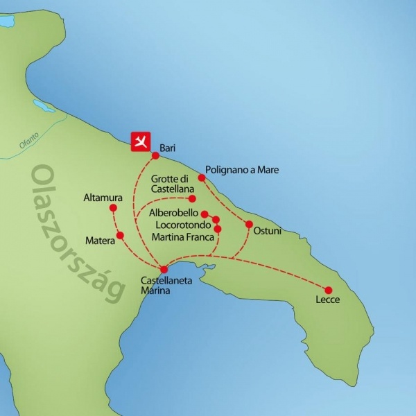Utazás Olaszországba, Bari repülőterére. Bari Puglia régió központja és egyben legnagyobb városa. Szállás: középkategóriájú hotelben.
