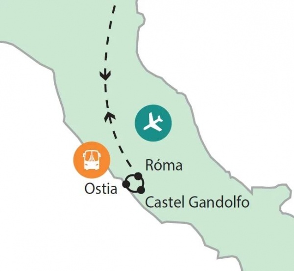 Menetrend függvényében, találkozás az idegenvezetővel a Liszt Ferenc Repülőtéren. Becsekkolás és repülés Rómába. Érkezést követően autóbuszunkkal Castel Gandolfóba utazunk. Itt található a pápa nyári rezidenciája, ami területileg a Vatikánhoz tartozik. Az Albano-tó partján fekvő település hangulatos belvárosáról, vatikáni palotáiról és a gyönyörű panorámájáról híres. Kora délután érünk Ostia Anticába. Ostiát Ancus Martius, az ókori Róma negyedik uralkodója alapította, mely 3 célt szolgált: kijáratot nyitott a tengerre, biztosította a só- és gabonaellátást, valamint meggátolta, hogy az ellenség felhajózzon a Tiberisen. Hangulatos város, amely a II. világháború után, a vasúti összeköttetés kiépültével vált a rómaiak kedvelt üdülőhelyévé. Az egykori hatalmas kikötőváros Pompeinél kétszerte nagyobb területű volt, a régészeti kutatások több emléket is feltártak itt, ilyen a Neptunusz fürdők, a Színház félköríves maradványa, az ókori római sírok, vagy a Borgo di Ostia Antica, XV. századi kastély. Kora este érkezünk szállásunkra és elfoglaljuk szobáinkat (3 éjszaka). Este fakultatív vacsora.