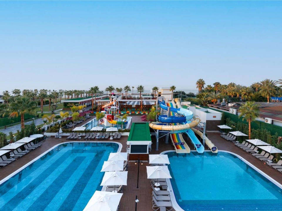 SZOLGÁLTATÁSOK: medencék napernyőkkel és napozóágyakkal • relaxációs medence felnőtteknek • beltéri medence • vízicsúszdák • főétterem • bárok (lobby, medence, tengerpart) • cukrászda • nappali és esti animációs programok • esti showműsor • élőzene • fitneszterem • asztalitenisz • darts • mini foci • strandröplabda • törökfürdő • gőzfürdő • szauna • wifi