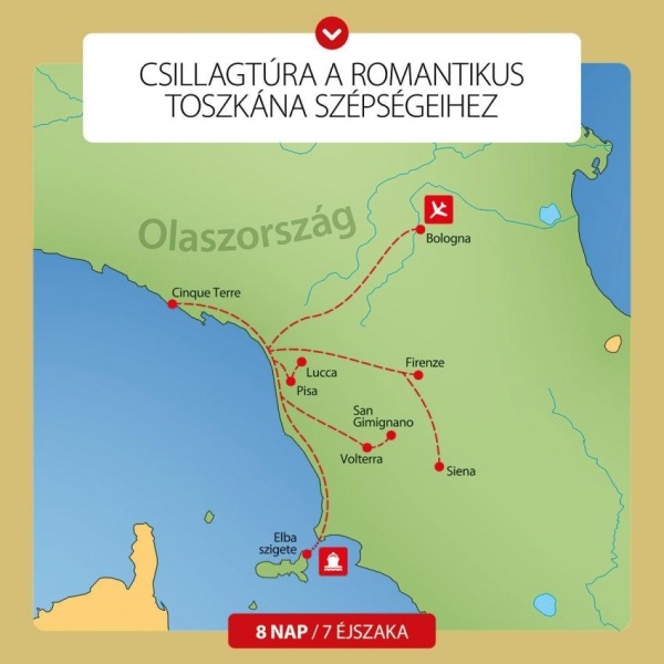 Szabadidő vagy fakultatív helyszínen foglalható fakultatív program: Cinque Terre. A mai napon elhagyjuk Toszkánát, és felfedezzük a magyarul Öt Földnek nevezett mesés vidéket a Ligúr-tengerparton. Ezen a vidéken öt városka osztozik. Innen közel egy évtizede kitiltották az autókat, csak vasúttal vagy vízi úton közelíthetőek meg. A hegyoldalról a Földközi-tengerre lenéző színpompás házak övezte vidék sokak bakancslistáján szerepel. Visszatérés a hotelbe.