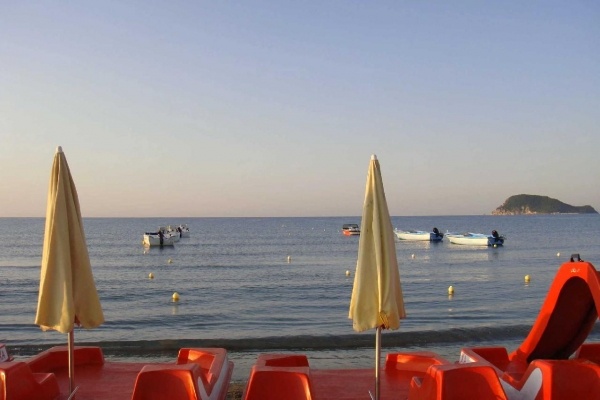 A központi, hosszú, homokos strand csak kb. 120 méterre, napágy és napernyő a parton térítés ellenében bérelhető.