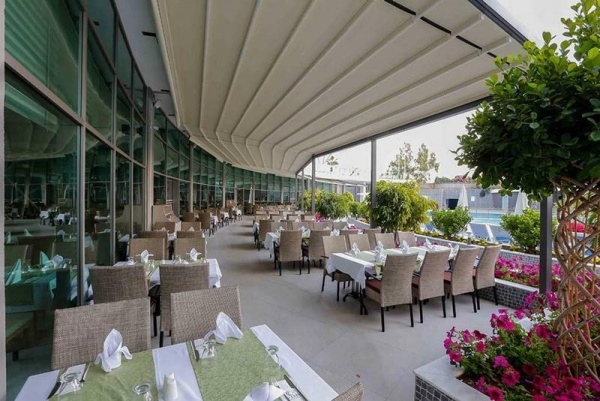 SZOLGÁLTATÁSOK: medencék napernyőkkel és napozóágyakkal o beltéri medence o aquapark o főétterem o bárok (lobby, medence, tengerparti stb.) o cukrászda o animációs programok o esti showműsorok o amfiteátrum o fitneszterem o aerobik o gimnasztika o darts o asztalitenisz o strandröplabda o törökfürdő o gőzfürdő o TV-sarok o wifi